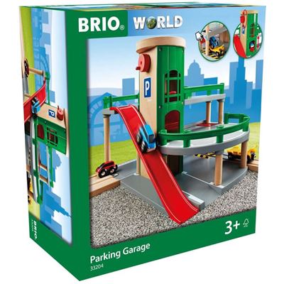 Bringe in dieser einzigartigen Parkgarage Schiene und Straße zusammen; Spaß auf allen Ebenen! Fahr auf die oberste Ebene und parke dein Auto. Oder nimm den Lift nach unten, tanke auf Ebene 1 oder stelle das Auto auf der Rampe in Ebene 2 ab. Drück den Knopf und das Auto fällt genau auf den Transportwagen unten auf der Eisenbahnschiene. Diese ist mit anderen BRIO Bahn- und Straßen-Sets kompatibel.
