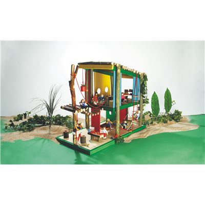 Inhalt: Baumhaus mit Lastenaufzug und Strickleiter, 2 Puppen, Regal, 2 Tische mit 6 Hockern und 1 Bank, 2 Tröge, 3 Matratzen mit Decke, Hängematte. Lieferbar ab 01.07.2003