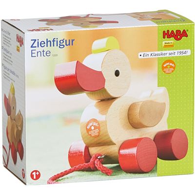 Die HABA-Ziehfigur Ente ist ein Klassiker seit 1954! Warum? Weil manche Spiel-Erlebnisse so schön sind, dass sie sich in jeder Generation wiederholen: Die ersten Schritte sind bei jedem Kind etwas Besonderes. Zuerst noch zaghaft an der Hand von Mama und Papa suchen die Kleinen schon bald nach neuen Begleitern für ihre Erkundungstouren. Dafür ist die niedliche Ziehfigur Ente ideal. Sie ist aus schönem Buchenholz in Deutschland gefertigt und ihr süßer großer Schnabel und die „rollenden Füßchen“ leuchten in intensivem Rot. Ziehen die Kinder an der Kordel, watschelt sie im Entengang lustig hinterher. Schnell wird sie zur liebsten Freundin, die überall dabei sein muss!