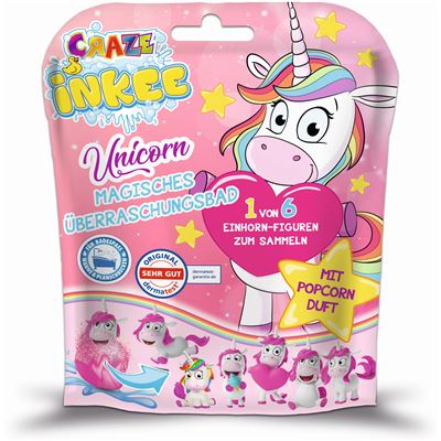 Wow! Wie das nach Pop-Corn duftet, wie das schäumt und in welchen schönen Farben!Die INKEE Surprise Bath ball Unicorn bietet für die vielen Einhorn-Fans mehrfachen Spaß. Während sich die Badekugel sprudelnd im Wasser auflöst und sich das Badewasser zu einem wunderschönen lila und rosa Schaumbad verwandelt und dabei einen süßen Popcorn-Duft im Raum verströmt, steigt die Spannung, welches der insgesamt 6 verschiedenen Einhörner wohl in der Badekugel enthalten ist.