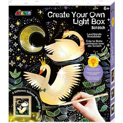 Dekorative Kratzbilder im magischen Leuchtkasten. Inhalt: 8 Kratzbilder, 2 Holzstifte, Leuchtkasten, Anleitung und Zubehör. Benötigt 2 AA Batterien (nicht enthalten).