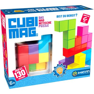 1 CUBIMAG mit 7 bunten magnetischen Puzzleteilen, 1 Aufgabenbuch