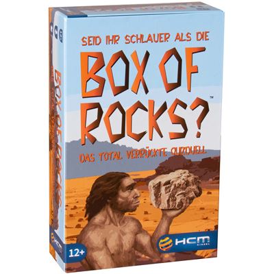 Box of Rocks ist ein ungewöhnliches Quizduell bei dem die Spieler gegen zwei simple Steine antreten. Die Spieler ziehen eine Karte, wählen eine der drei Fragen aus und versuchen diese zu beantworten. Die Besonderheit des Spiels: Die Antwort kann entweder 0, 1 oder 2 sein. Denn jeder Stein in der Box hat eine Blanko-Seite und eine Seite mit einem Strich. Wird die Box nun geschüttelt und der Deckel geöffnet, zeigen die Steine auch eine der Zahlen 0, 1 oder 2 an. Wer hat die richtige Antwort gegeben? Mensch oder Stein?