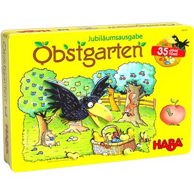 Weltweit begeistert das HABA Spiel Obstgarten mit seiner einfachen und gleichzeitig faszinierenden Spielidee: Im Obstgarten hängen die saftigsten Kirschen, Äpfel, Pflaumen und Birnen. Doch die will ein anderer stibitzen: Rabe Theo ist schon im Landeanflug! Jetzt brauchen die Spieler etwas Würfelglück. Gemeinsam versuchen sie, die Früchte zu ernten, bevor der freche Rabe den Obstgarten erreicht. Das stärkt das Wir-Gefühl! Weil es den beliebten HABA Klassiker Obstgarten nun schon seit 35 Jahren gibt, ist er als Jubiläumsausgabe in einer limitierten Auflage in einer hochwertigen Metalldose erhältlich. Kinder haben mit der Jubiläumsausgabe nicht nur großen Spielspaß, sondern trainieren auch das Erkennen und Zuordnen von Farben.