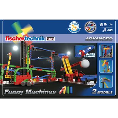 Ein kleiner Anstoß bringt Action ins Kinderzimmer. Der Baukasten ADVANCED Funny Machines ist ein witziges, buntes Einsteiger Set für junge Konstrukteure ab sieben Jahren zum Thema Kettenreaktionen. Die drei nach Bauanleitung baubaren Kettenreaktionsmodelle bringen Action ins Kinderzimmer. Die Modelle funktionieren wie ein Dominoeffekt, wobei eine fischertechnik Schikane eine weitere Reaktion auslöst. Das kleine Auto trifft auf eine Schikane, die ein Gewicht freigibt. Kaum fällt das Gewicht auf eine weitere Platte, rollt die Kugel einen Parcours entlang bis hin zur Gauß-Kanone. Und dann kommt noch mehr Geschwindigkeit ins Spiel: Die Kugel beschleunigt über diese Magnetkanone eine weitere Kugel durch einen Parcours hindurch. Am Ende der lustigen Ereigniskette wird ein Katapult auslöst, das wiederum einen Ball ins Ziel wirft.