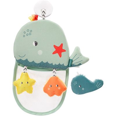 Perfekter Begleiter für jeden Badetag: Der niedliche Bade-Utensilo Wal aus der Plansch & Play Kollektion ist ein toller Freund für die Badewanne. Der Wal wird einfach mit seinem Saugnapf an der Wand der Badewanne befestigt und kann so kleinere Badespielzeuge in seinem praktischen Netz aufbewahren. Da kommt beim Baden richtig Freude auf: Der große Wal-Utensilo wird begleitet von einem kleinen Wal, der zusammen mit Seestern und Muschel zum Greifen und Spielen einlädt. Die kleinen Badefreunde fördern mit verborgenem Raschelpapier und Rasseln spielerisch die Sinne und sorgen für Spaß in der Wanne. So ist der Bade-Utensilo nicht nur ein praktischer Begleiter für jeden Badetag, sondern bietet sicher auch über lange Zeit großen Spielspaß.