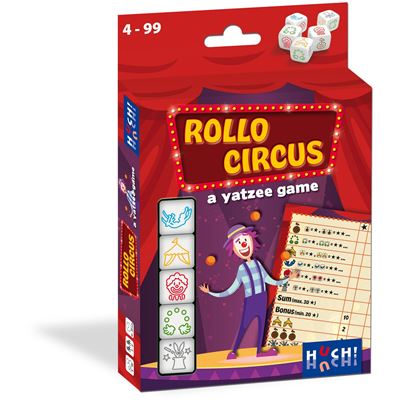 Eine einfache Yatzee-Variante für Kinder ab 4 mit tollen Zirkusmotiven. Pro Runde darf bis zu dreimal gewürfelt werden. Ziel ist es, durch geschicktes Kombinieren möglichst viele Vorgaben punktereich zu erfüllen. Die Ergebnisse werden auf dem mitgelieferten Block eingetragen. Für fünf gleiche Motive gibt es die maximale Punktzahl. Wer holt sich noch einen Bonus? Der Würfelspaß für die ganze Familie - perfekt zum Mitnehmen.