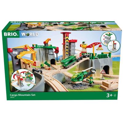 BRIO Eisenbahn-Action auf fünf Ebenen! Der Aufzug bringt die beladenen Waggons auf den höchsten Punkt des Bergmassivs. Hier startet die rasante Fahrt bergab: Über die Kurvenrampen gelangt die wertvolle Fracht in einem Rutsch bis ins Tal, wo LKW und Helikopter auf den Weitertransport warten. Für noch mehr Verladespaß stehen der 360° drehbare Holzkran und die Frachtverladestation mit Rutsche bereit. Aus den Berg- und Tunnelelementen können Kinder verschiedene Strecken-Layouts konstruieren.