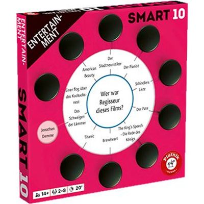 Smart 10 Entertainment bringt das bewährte Quizkonzept auf die nächste Stufe – mit spannenden Fragen aus der Welt der Unterhaltung. Diese Themenedition enthält 50 beidseitig bedruckte Karten, also 100 neue Fragen mit insgesamt 1.000 möglichen Antworten. Ob Castings bekannter TV-Serien, die 50 meistbesuchten Websites, Erscheinungsjahre von Apple-Geräten oder Charaktere aus „Toy Story“ – hier dürfen Film-Junkies und Popkultur-Fans glänzen.