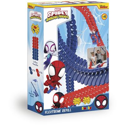 Mit dem praktischen Spidey FleXtreme Schienen-Ergänzungsset kann die bestehende Spidey FleXtreme Rennbahn ideal ergänzt werden. Denn mit den bunten, flexiblen Schienen-Teilen lässt sich der FleXtreme-Parcours beliebig erweitern und zu einer extra-großen Spielwelt vergrößern. Die beiden exklusiven Saugnapf-Befestigungen mit Spinnennetz sorgen für den ultimativen Spidey-Look und machen eine kreative Führung der Rennbahn-Strecke möglich. Dabei sorgen die Supporter für noch mehr Kurvenkontrolle und verhindern ein Aushaken des Racing Cars durch zu steile Krümmungen. Das Fixiersystem ist bereits von kleineren Kindern leicht zu verstehen und ermöglicht eine Befestigung an einer Vielzahl von glatten Oberflächen. Das Set besteht aus insgesamt 72 Schienenteilen in vier Farben und lässt sich zu einer Streckenlänge von 1,72 m zusammenfügen.