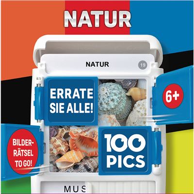 Kennst du dich aus in der Natur? 100 Eindrücke aus der Natur warten darauf von dir erraten zu werden. Reicht die Buchstabenkombination oder brauchst du einen oder mehrere Bildausschnitte? Kannst du alle 100 Eindrücke erraten? 100 PICS ist die clevere Kombination aus Wort- und Bilderrätsel, verpackt in der einzigartigen Quiz-Box. Die Spieler müssen 100 Bildkarten nur anhand von Buchstabenkombinationen oder mit verborgenen Bildinformationen erraten. Der integrierte Schieber enthüllt nach und nach die Lösung. Die geniale Quiz-Box mit vier aufklappbaren Fenstern ist kompakt, praktisch und bietet viele Spiel-Möglichkeiten.