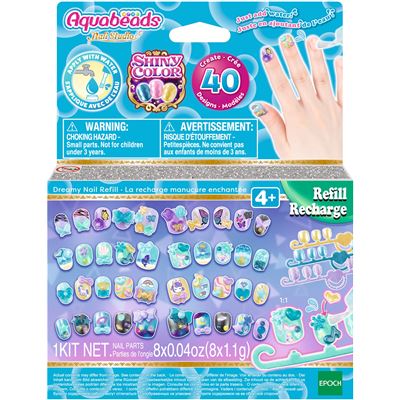 Um noch mehr tolle Fingernägel Kreationen mit dem Aquabeads Nagelstudio zu designen gibt es das Aquabeads Fingernagel Nachfüllset. In diesem Nachfüllset in Blau und Grün sind Fingernägel in 8 Farben und Sticker zum dekorieren enthalten. Bis zu 40 kreative Designs können damit designt werden. Für Kinder ab 4 Jahren geeignet.