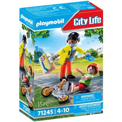 Figuren: 1 Sanitäter, 1 verletztes Kind Zubehör: 1 Roller, 1 Verbandskoffer, 2 Verbandsschienen, 1 Helm, 1 Etikettenbogen mit Verbandsmaterial, 2 Badeschlappen.