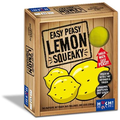 *Easy Peasy Lemon Squeaky* ist ein temporeiches und humorvolles Partyspiel, das jede Runde zu einem spritzigen Erlebnis macht! Hier sind Schnelligkeit, Wissen und Reaktionsvermögen gefragt, denn die Spieler müssen blitzschnell Aufgaben erfüllen oder Fragen beantworten, um sich einen Punkt zu sichern. Im Zentrum des Spiels steht die Quietsch-Zitrone – wer sie zuerst drückt, gewinnt das Zitronenplättchen und kommt dem Sieg ein Stück näher.