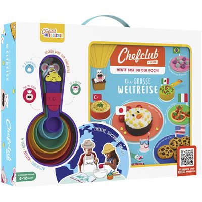 Die große Weltreise mit Chefclub Kids ist ein Set, das Kindern die Welt und ihre kulinarischen Unterschiede näher bringt. Mit 20 ikonischen Rezepten aus allen Ecken der Welt, Informationen zu den Ländern und unterhaltsamen Zeichnungen zu Sehenswürdigkeiten der verschiedenen Länder und den praktischen Chefclub Kids Messbechern, werden Kinder mit Spaß und Freude an die Küche herangeführt. Um die Selbstständigkeit der Kinder zu fördern, sind die Etappen illustriert und die Zubereitung wird durch die bunten Messbecher erleichtert. Zusätzlich sind die Rezepte mit QR Codes ausgestattet und machen die Nutzung interaktiv, man gelang sofort zu den Videorezepten.