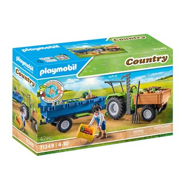 Figuren: 1 Mann; Zubehör: 1 Traktor m. Anhänger, 4 Tetrapacks, 3 Äpfel, 2 Salate, 1 Paprika, 1 Gurke, 5 Transportboxen, 1 Heugabel, 2 Blumenkohl, 2 Brote, 1 Eier,1 Knoblauch, 1 Karotten, 1 Weidekorb, 1 Kartoffelkorb