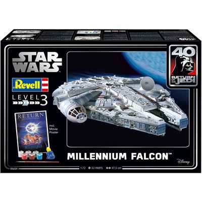 Feiere den 40. Jahrestag des Filmklassikers "Die Rückkehr der Jedi" aus dem Jahr 1983 mit dieser Sonderausgabe des Millennium-Falken-Geschenksets! Der Millennium Falke war ein stark modifizierter YT-1300 Leichtfrachter, der nach zahlreichen Besitzerwechseln dem Corellianer Han Solo gehörte. Dieser detaillierte Modellbausatz im Maßstab 1:72 mit 52 Teilen verfügt über eine bewegliche Rampe, Klarsichtteile, eine drehbare Antenne, Pilotenfiguren und die Möglichkeit, mit ausgefahrenen Landebeinen oder geschlossenen Schächten zu bauen. Außerdem werden ein Poster, Klebstoff, Pinsel und die wichtigsten Farben mitgeliefert, damit du sofort loslegen kannst. Das perfekte Geschenk für jeden "Star Wars" Fan und angehenden Modellbauer!