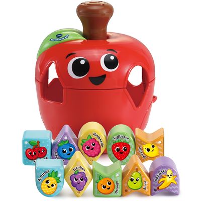 Früchte, Formen und Farben kennenlernen mit dem lustigen Sortierspaß-Apfel! 10 Obstsorten warten darauf, in die richtigen Öffnungen sortiert zu werden. Drückt man auf den Stiel, dreht sich die obere Hälfte des Apfels und verändert die Formen, sodass alles einsortiert werden kann. Dank praktischer Klappe am Apfel können alle Formen wieder herausgeholt werden.