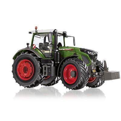 Details: Das WIKING-Modell verfügt über eine vorbildgerechte Bereifung mit ausgeprägt landwirtschaftlichem Profil. Dabei unterstreichen die außergewöhnlich breiten Reifen den bulligen Charakter. Es ist schon eine gute modellbauerische Tugend, dass sich Räder wechseln lassen. Auch dabei fällt die detaillierte Felgengestaltung sogleich ins Auge. In der Kombination der Bauteile fertigt WIKING die komplette Bodengruppe aus Metall, gleiches gilt für Motorhaube und Rahmen. Das Modell verfügt über wechselbare Räder, die inklusive Schlüssel mit magnetischen Abdeckungen bereitgestellt werden. Die Motorhaube ist zum Öffnen angelegt, die Ober- und Unterlenker können bewegt werden, heckseitig lässt sich der Oberlenker ausziehen. Der Fendt-Schlepper verfügt über ein höhenverstellbares Zugmaul und ein abnehmbares Frontgewicht. Fahrertür und Heckfenster lassen sich öffnen, während der Aufstieg rechts ebenso klappbar ist wie der innenliegende Beifahrersitz. Am Dach befinden sich bewegliche Warnleuchten und klappbare Außenspiegel. Die Pendelachse kann vorbildgerecht direkt übers Lenkrad gesteuert werden. Rechtsseitig befindet sich der Werkzeugkasten. Kennzeichen, Warnschilder und Leuchten sind ebenso filigran bedruckt wie die Hydraulikanschlüsse. Unter der Motorhaube befindet sich die detaillierte Motordarstellung, während die Leuchten filigran eingesetzt sind. Notwendige Warntafeln finden sich auf den Kotflügeln wieder. Der Schlepper rollt auf grobstolligen Reifen.