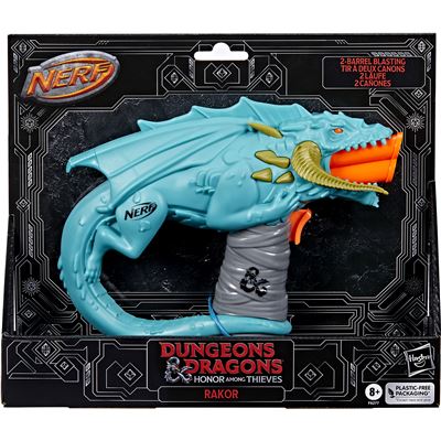Der Nerf Dungeons & Dragons Rakor Blaster bringt die fantasievolle Story aus dem D&D Film und dem beliebten Rollenspiel nach Hause. Der Dart-Blaster feuert 2 Nerf Elite Darts ab und bietet aktiven Spielspaß. Er ist von dem schwarzen Drachen Rakor inspiriert, der in den vergessenen Reichen jeden Abenteurer mit seinem sauren Atem angreift, der es wagt, ihn um seinen Schatz herauszufordern. Das Abenteuer in der magischen Welt von D&D kann mit einer Nerf D&D Kollektion aus Blastern und Ausrüstungen fortgesetzt werden. (Jeweils separat erhältlich. Je nach Verfügbarkeit.) Der Blaster beeindruckt mit einer unkomplizierten Handhabung. Einfach 2 Darts von vorne einsetzen, den Hebel nach unten ziehen und den Abzug drücken, um 1 Dart abzufeuern. Der Blaster enthält 4 Nerf Elite Darts und eignet sich bestens als Geschenk für Kinder ab 8 Jahren, die actionreichen Spielspaß und fantasiereiche Spielzeuge mögen. Eine Brille wird empfohlen (nicht enthalten). Keine Batterien erforderlich.