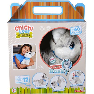 Der Happy Husky mit den treuen blauen Augen ist nicht nur kuschelig weich, er reagiert auch auf die Stimme der Kinder wie ein echter Hund und kann 12 tolle Tricks vorführen. Durch 12 verschiedene Sprachbefehle und über 60 Sounds kann der Happy Husky laufen, „Sitz“ oder „Platz“ machen und sogar tanzen. Auch Männchen machen oder Kopfstand gehören zu seinem Repertoire. Zur Belohnung freut er sich über Streichel- und Kuscheleinheiten der Kinder, zu denen sein kuschelweiches Fell einlädt