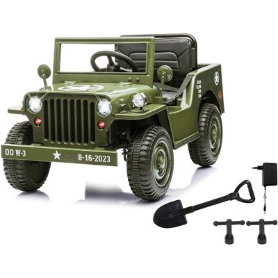 Dieses Fahrzeug kennt jeder. Der Willys MB mit der Kurzbezeichnung Jeep, gilt als Urtyp der PKW-Geländewagen. JAMARA bringt dieses Geländefahrzeug als elektrisches Kinderfahrzeug in originalgetreuem Design und Farbe in die heimischen Kinderzimmer. Den Fahrakku einfach an der Steckdose auftanken, einsteigen, Gas geben und los cruisen. Das wird Ihre Kleinen begeistern, mit Motorhaube und Heckklappe zum Öffnen, LED-Licht, Hupe und realistischen Motor-Soundeffekten, USB-Anschluss und Bluetooth – ist alles verbaut was zum realistischen Spiel dazu gehört. Zwei leistungsstarke Motoren treiben die Räder des Fahrzeuges an – und mit über einer Stunde Fahrzeit mit nur einer Ladung, ist dank des 12V Akkus, echter Spielspaß garantiert.