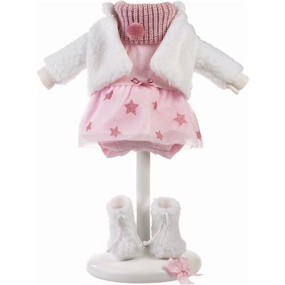 Stylisches Tütükleid mit Sternmotiven kombiniert mit rosa Höschen sowie Strickjacke und weissen Söckchen und einem altrosa Schal. Passend für 35cm Puppen.