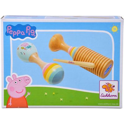 Peppa Pig, Set mit Maraca und Ratsche: Mit dem Peppa Pig Musik Set werden Kinder mit Ratsche und Maraca musikalisch aktiv. Beide Instrumente sind bunt lackiert und mit Motiven verziert. Ein Stick für die Ratsche ist im Set enthalten.