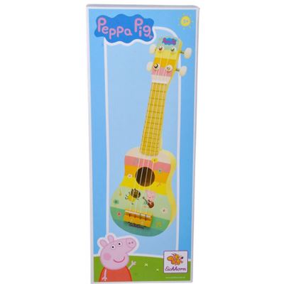 Peppa Pig, Holz Ukulele, 43 cm: Die 43 cm große Holz Ukulele erzeugt harmonische Töne und trägt zur positiven Entwicklung der auditiven Wahrnehmung des Kindes bei. Die stabile kleine Gitarre hat einen Hals und einen Steg aus Holz und 4 hochwertige Metallsaiten mit einer Stimmmechanik zum Spannen.
