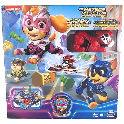 Paw Patrol - Die Meteor Mission. Das Spiel zu "Der Mighty Kinofilm": Ein geheimnisvoller Meteorit ist genau über Abenteuerstadt abgestürzt und hat die Paw Patrol Zentrale unter sich begraben. Bei genauerer Untersuchung entdeckt die Paw Patrol, dass die Kräfte des Meteoriten sie in superstarke Mighty Pups verwandeln können. Marshall kann so plötzlich mit Feuerkugeln um sich werfen. Mit seiner Tollpatschigkeit sorgt er dabei für großes Chaos - während die Fellfreunde der Paw Patrol den Meteoriten weiter erforschen. Welchem Vierbeiner gelingt es, den aufgedrehten Marshall zu umgehen und als Erster zum Meteoriten zu gelangen? Jeder Spieler versucht, seine 4 Spielfiguren ins Zentrum des Spielplans zu bringen. Dazu wird mit 2 Würfel gewürfelt - und sobald ein Marshall-Symbol auftaucht, wird der Aufzieh-Marshall aktiviert, der kreuz und quer übers Spielfeld saust und alle Figuren in seinem Weg umwirft, diese müssen dann zurück aufs jeweilige Startfeld. Jeder Spieler darf seine Figuren auch zum Turm stapeln, um Marshall weniger Gelegenheit zum Umwerfen zu bieten. Wer zuerst all seine 4 Figuren zum Metoriten im Zentrum bringt, gewinnt. Das liebevoll gestaltete Spielmaterial enthält neben dem großformatigen Spieplan (ca. 51x51 cm) auch 16 Spielfiguren der Paw Patrol mit Skye, Chase, Rocky und Rubble in ihren Kinofilm-Outfits. Einfache, bekannte Spielprinzipien ermöglichen das schnelle Losspielen. Der Spielspaß mit der Paw Patrol wird bei "Die Meteor Mission" groß geschrieben. Erlebt beim Spielen die spanned-spaßige Atmosphäre von "Der Mighty Kinfilm". Für 2-4 Spieler ab 4 Jahren. Spieldauer: ca. 20 Minuten. Paw Patrol - Die Meteor Mission. Das Spiel zu "Der Mighty Kinofilm": Jeder Spieler versucht, seine 4 Spielfiguren ins Zentrum des Spielplans zu bringen. Doch sobald ein Marshall-Symbol gewürfelt wird, wird der Aufzieh-Marshall aktiviert, der kreuz und quer übers Spielfeld saust und alle Figuren in seinem Weg umwirft. Wer zuerst all seine 4 Figuren zum Metoriten im Zentrum bringt, gewinnt. Einfache, bekannte Spielprinzipien ermöglichen das schnelle Losspielen Das liebevoll gestaltete Spielmaterial enthält neben dem großformatigen Spieplan (ca. 51x51 cm) auch 16 Spielfiguren der Paw Patrol mit Skye, Chase, Rocky und Rubble in ihren Kinofilm-Outfits Das Spiel zur Kinofilm-Story: Ein geheimnisvoller Meteorit ist genau über Abenteuerstadt abgestürzt und hat die Paw Patrol Zentrale unter sich begraben. Bei genauerer Untersuchung entdeckt die Paw Patrol, dass die Kräfte des Meteoriten sie in superstarke Mighty Pups verwandeln können. Marshall kann so plötzlich mit Feuerkugeln um sich werfen. Mit seiner Tollpatschigkeit sorgt er dabei für großes Chaos - während die Fellfreunde der Paw Patrol den Meteoriten weiter erforschen Der Spielspaß mit der Paw Patrol wird bei "Die Meteor Mission" groß geschrieben. Erlebt beim Spielen die spanned-spaßige Atmosphäre von "Der Mighty Kinfilm". Für 2-4 Spieler ab 4 Jahren. Spieldauer: ca. 20 Minuten. Spaß für alle: Bei Treffen mit Freunden dürfen die Brettspiele, Kinderspiele, Spielzeuge oder Kartenspiele von Spin Master nicht fehlen. Für Spieleabende mit der ganzen Familie, Kinderfeste, Geburtstage, Partys, Reisen und jeden Anlass, bei dem Menschen gemeinsam Spaß haben möchten.