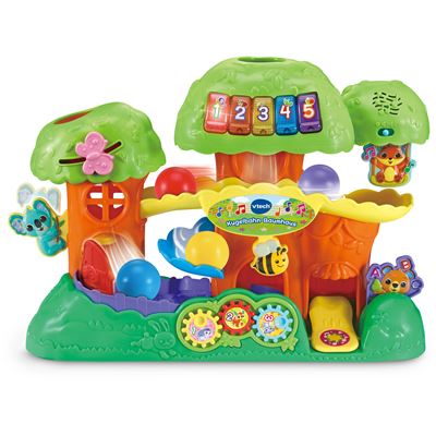 Das Kugelbahn-Baumhaus verspricht kunterbunten Kullerspaß und unterstützt spielend beim Lernen der Zahlen! Lassen die Kleinen die bunten Kugeln in die Öffnung der Baumkrone rollen, so werden die Kugeln gezählt. Dank der Spirale in der Baumkrone ist es zudem immer wieder eine Überraschung, welchen Weg durch das Baumhaus die Kugeln nehmen. Besonders lustig: Entlang der Kugelbahn sitzen niedliche Tierfreunde, die durch die vorbeirollende Kugel bewegt werden! Auch weitere farbenfrohe bewegliche Elemente wie der Schmetterling zum Schieben oder die bunten Zahnräder laden zum Ertasten ein und fördern dabei die Motorik der Kleinen. Für zusätzlichen Spielspaß sorgen die fünf Leuchttasten am Baumhaus. Werden sie gedrückt, benennen sie Farben, Zahlen und Tiere und spielen lustige Musik und niedliche Geräusche ab.