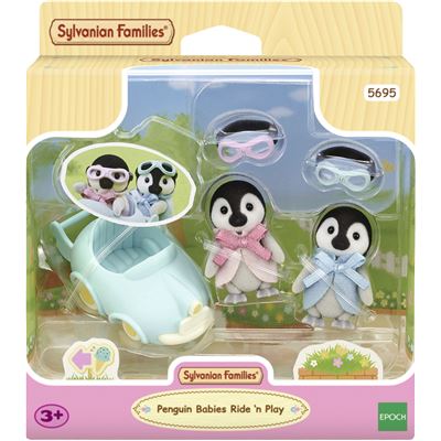 Die Sylvanian Families Pinguin Zwillinge Pearl und Rocky sind echte Rennfahrer. Sie lieben es, in ihrem kleinen Auto herum zu fahren. Pearl, das Pinguin Baby, badet gerne. Sie singt sogar in den Duschkopf, als wäre es ein Mikrofon. Ihr Zwillingsbruder Rocky ist ein guter Kletterer. Er klettert immer wieder irgendwo hoch, um dann wieder herunter zu hopsen. Im Pinguin Fahr- und Spielset ist neben den zwei Figuren auch ein kleines Auto enthalten, auf dem eine Figur mitfahren kann. Das Fahrzeug ist mit anderen Fahrzeugen aus den Zwillingssets kombinierbar. Die beiden Sylvanian Families Pinguin Zwillinge sind ca. 4 cm groß und für Kinder ab drei Jahren geeignet.