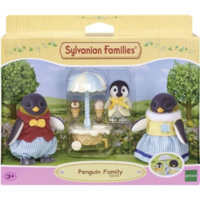 Die Sylvanian Families Pinguin Familie Waddle liebt Eis über alles. Sie treffen sich immer gerne an ihrem kleinen Eisstand mit Schirm. Ozzie, der Pinguin Vater, liebt es zu essen. Er isst und isst, bis sein Bauch kugelrund ist. Dann setzt er sich hin und schläft. Die Pinguin Mutter Sapphire genießt es, auf dem Eis zu tanzen. Ihre Tänze auf dem Eis sind sehr anmutig und elegant. Das Pinguin Baby Kippie kann man nicht leicht aus der Fassung bringen. Er ist ein sehr gemütlicher Pinguin beeilt sich eher selten. Aber wenn er ein Eis sieht, watschelt er so schnell wie seine Füße ihn tragen können. Im Figuren Set sind Mutter, Vater, ein Baby und ein kleiner Eisstand enthalten. Kopf, Arme und Beine der großen Figuren sind beweglich. Ihre Kleidung kann an- und ausgezogen werden. Die samtig-weichen Figuren der Sylvanian Families Pinguin Familie sind zwischen 4 und 8 cm groß und für Kinder ab drei Jahren geeignet.