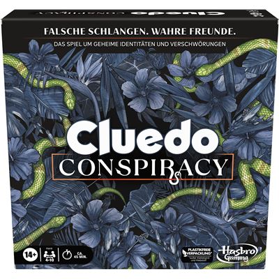 Bei Cluedo Conspiracy geht es um geheime Identitäten und Verschwörungen! Als Gäste des Viper Resorts entdeckt ihr, dass jemand versucht, den Manager Mr. Coral umzubringen. Eine Serie tödlicher Fallen wurde auf dem Resort verteilt und jemand ist bewaffnet! Jetzt ist es an euch, das ultimative Geheimnis zu entschlüsseln: Wem ist zu trauen? Ihr schlüpft in die Rolle von Cluedo Charakteren und nehmt in Teams geheime Identitäten an: Freunde gegen Verschwörer. Die Freunde versuchen, für Corals Sicherheit zu sorgen und herauszufinden, WER die Verschwörer sind und WO und WOMIT das Komplott geplant war. Die Verschwörer versuchen heimlich, die Freunde zu hintergehen und den Mord an einem bestimmten Ort mit einer bestimmten Waffe durchzuführen. Beide Teams finden dabei Beweise und sprechen darüber – oder auch nicht! Welche Seite wird Erfolg haben? Dieses spannende Spiel für 4–10 Spieler ist ein tolles Gruppenspiel ab 14 Jahren. Als Geschenk für Fans von Krimis, Geheimrollen und dem klassischen Cluedo.