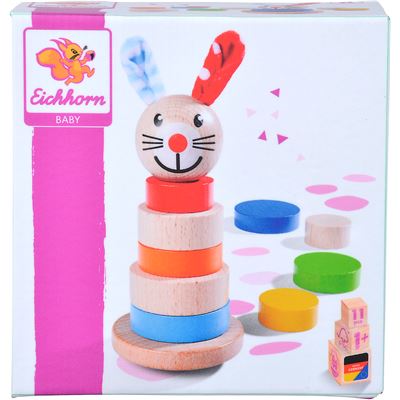 Eichhorn Baby Stapelturm Hase: Mit dem 20 cm großen, farbenfrohen Eichhorn Stapelturm mit Hasenkopf aus Plüsch werden die Kleinen spielerisch mit den Größenverhältnissen vertraut gemacht. Der Stapelturm fördert die Geschicklichkeit, die Hand-Augen-Koordination und die Fingerfertigkeit der Kleinen. Die neun bunten Scheiben in vier verschiedenen Größen und Farben können der Größe nach sortiert, oder nach Belieben kunterbunt übereinandergestapelt werden. Für die Herstellung des Eichhorn Stapelturms wird ausschließlich FSC 100% Holz aus nachhaltiger Forstwirtschaft verwendet. Der Artikel ist Made in Germany und für Stapler ab einem Jahr geeignet.