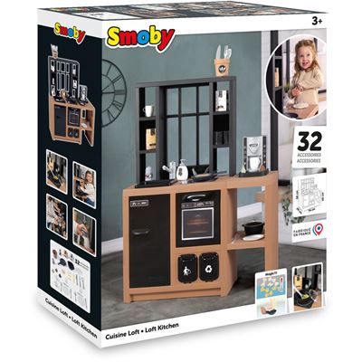Die Smoby Loft-Küche ist ein Muss für Kinder, die gerne kochen! Mit ihrem außergewöhnlichen Industrie-Look, den klaren Linien und den trendigen Farben ist diese Küche der Hingucker in jedem Zuhause. Die Spielküche bietet großzügige Spielflächen, so dass mehrere Kinder zusammenspielen können, beansprucht aber dank ihrer gleichzeitig kompakten Abmessungen nicht zu viel Platz. Ausgestattet mit allem, was eine echte Küche ausmacht - so können schon die Kleinen kochen wie die Großen: Herdplatte, Backofen, Kühlschrank, Kaffeemaschine, Spüle und Behälter zur Mülltrennung zählen zur umfangreichen Küchenausstattung. Dazu gibt es 32 detailgetreue Zubehörteile: 3 Küchenhelfer, 2 Gabeln, 2 Messer, 2 Löffel, 2 Teller, 2 Gläser, 2 Tassen, 3 Kaffeekapseln, 1 Bratpfanne, 1 Schmortopf, 1 Deckel, 2 Spiellebensmittel-Leerverpackungen, 1 Pfannkuchen, 5 hitzeempfindliche Nudeln, die in kaltem Wasser die Farbe wechseln, 1 Salz-Pfeffermühle mit Cric-Cric-Funktion sowie 2 Töpfchen zur Aufbewahrung.