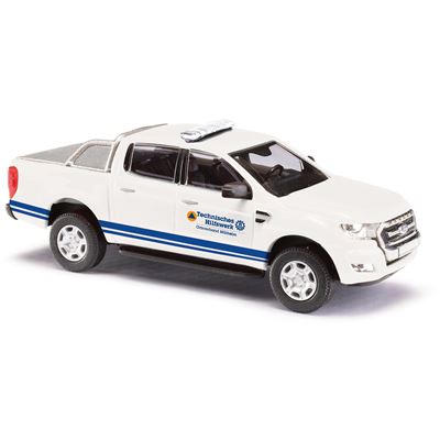 Weißer Pick-up mit blauem Doppelstreifen des Technischen Hilfswerks des Ortsverbandes Mühlheim (Hessen). Das Modell hat einen beidseitigen Aufdruck des Katastrophenschutz-Logos – orangefarbener Kreis mit blauem Dreieck.