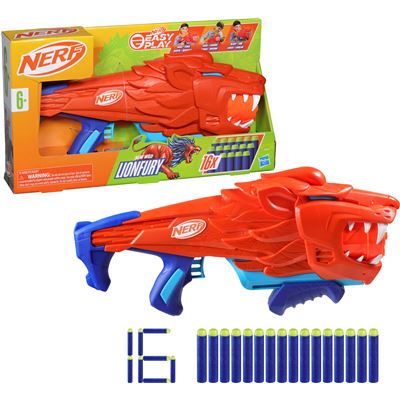 Nerf Junior Wild Blaster sind mit speziellen Features ausgestattet, die das Spielen erleichtern, so dass kleine Kinder ganz alleine mit diesen wild aussehenden Blastern spielen können. Sie liegen dank ihrer Größe gut in einer kleineren Hand und können aufgrund des geringen Gewichts leicht bei Spielen im Garten getragen werden. Das Laden von vorne, macht das Einlegen der Darts ganz leicht und da die Griffe über die geringste Zugkraft aller Nerf Blaster verfügen, ist das Feuern ganz einfach. So können auch schon jüngere Kids den Spielspaß für sich entdecken. Sie sind perfekt für Jungen und Mädchen, die sich zum ersten Mal in die Nerf Action stürzen. Der Nerf Junior Wild Lionfury Blaster hat ein cooles Löwendesign, das das Aussehen dieser wilden Raubkatze mit lebhaften Farben und spannenden Details einfängt! Dieser Nerf Blaster kommt mit 16 Nerf Elite 2.0 Darts aus Schaumstoff. Eine Brille wird empfohlen (nicht enthalten).