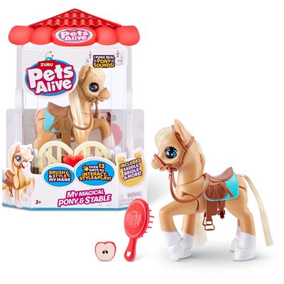 Dieses niedliche Pony vom neuseeländischen Spielzeughersteller ZURU ist perfekt für kleine Pferdeliebhaber, es erwacht wirklich zum Leben! Das Pets Alive My Magical Pony macht echte Ponygeräusche, wenn es mit einem Apfel gefüttert wird. Es liebt es, wenn man seine Mähne mit der mitgelieferten Bürste bürstet und ist mit dem Zaumzeug und dem Sattel bereit für einen Tag voller Spaß. Die Verpackung dient als Stall für das Pony und ermöglicht damit unendlichen Spielspaß für die kleinen Pferdeliebhaber.