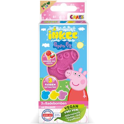 Verwandle dein Badeerlebnis in ein aufregendes Abenteuer mit unserem INKEE Mini Pack Peppa Pig Badebomben in niedlicher Peppa Pig-Gesichtsform. Jede Packung enthält 3 Badebomben in den Farben Blau, Gelb und Pink mit hochwertigem Mandelöl. Wenn du sie ins Wasser gibst, verwandelt sich das Wasser in lebendige Farben und sprudelt mit einem herrlichen Erdbeerduft.