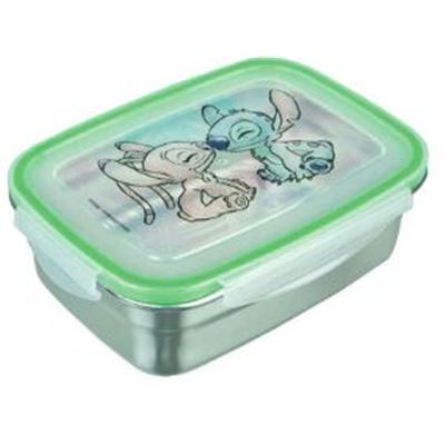 Die Edelstahldose mit transparentem Deckel lässt sich durch vier Verschlüsse luftdicht schließen. Auf dem Deckel findet man erneut ein filigranes Motiv von Angel und Stitch in zurückhaltenden Farben. Die Brotdose eignet sich mit einem Fassungsvermögen von 550 ml für das Pausenbrot oder den Lunch.