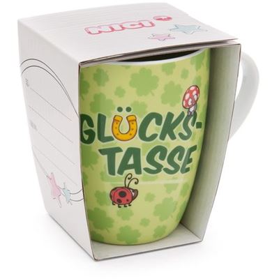 Glück kann man im Leben nie genug haben! Mit der bezaubernden "Glückstasse" von NICI schenkt man sich oder anderen eine Tasse voller Glück ein. Die hochwertige Porzellantasse mit einem Inhaltsvolumen von 310ml ist über und über mit grünen Glückskleeblättern sowie weiteren Glückssymbolen, wie Hufeisen, Marienkäfer und Fliegenpilz bedruckt. Mit dieser Tasse startet garantiert jeder gut gelaunt und mit einer gehörigen Portion Positivität in den Tag. Die robuste Tasse ist eine schöne Geschenkidee für Anlässe wie Geburtstag, Genesung oder als Mitbringsel zum Jahreswechsel. Verpackt ist die neue Lieblingstasse mit einer hübschen Banderole, die Platz für eine persönliche Botschaft bietet.