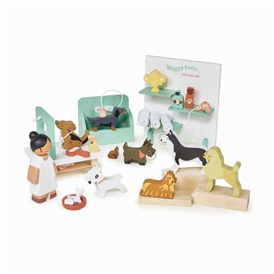 Willkommen im Hundesalon Waggy Tails, wo unsere Hundefrisörin sieben verschiedene Hunderassen pflegt und verwöhnt. Zu den Rassen gehören: Riesenpudel, Husky, Beagle, Bullterrier, Dackel, Shih Tzu und Scotty Dog. Im Set enthalten sind ein Waschbereich mit Duschkopf und drei Handtüchern, ein Pflegetisch mit Bürste, eine selbststehende Rückwand mit steckbarem Haartrockner und Schermaschine, 3 Hundeprodukte in Flaschen und eine Siegertrophäe, 3 Podeste zum Ausstellen der frisierten Hunde, eine Decke, 2 Knochen in einer Schale und ein kleines Hundehäufchen!