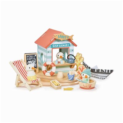 Triff Sandy die Möwe und ihre Familie am Strand, wo sie eine kleine Strandhütte bewohnen und diese in eine Fisch- und Pommesbude verwandelt haben. Auf zwei Sockeln aus Holz, die wie Sand aussehen, haben sie zwei Stücke Seetang, einen Liegestuhl, einen Kessel, einen Holzeimer mit Eis und Löffel, drei Fische in einer Schüssel, einen Eimer mit Pommes Frites, ein Fish & Chips-Schild, eine Sandburg, ein Stück Kandis und ein Boot aus Zeitungspapier gesammelt. Gully, der Möwenpapa mit der gestrickten Mütze und einem abnehmbaren Gummiring aus Holz hilft auch tatkräftig mit. Die Möwen sind mit ihrem Namen angeschrieben, sodass die kleinen Figuren Teil der Geschichten über Abenteuer am Meer werden. Perfekt für kreatives Geschichtenerzählen und fantasievolles Spielen.