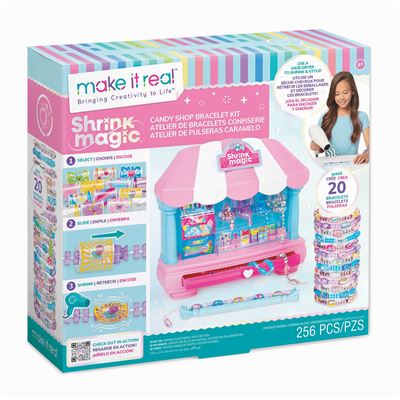 1 Bastelset für Süßigkeiten-Armbänder, 1 Schrumpfschale, 20 Perlenschnüre, 2 bonbonförmige Anhänger, 231 Shrink Magic-Hüllen, 1 Anleitung