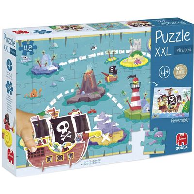 „Ahoi, ihr Landratten“ heißt es beim „XXL Puzzle - Piraten“. Mit 48 Puzzleteilen ist es schon etwas schwieriger zusammenzusetzen. Doch mit etwas Übung gelingt das schon kleinen Piraten ab 4 Jahren. Die einzelnen Teile sind doppelseitig verwendbar, so entstehen gleich zwei lustige Piratenmotive. Die Vorderseite zeigt ein Piratenschiff mit tierischen Piraten darauf. Umgedreht entsteht Stück für Stück eine schön illustrierte Schatzkarte, die die Fantasie der Kinder anregt. Besonderes Highlight ist das 3-D-Piratenschiff. Also ran an die Puzzleteile und los geht’s zum nächsten großen Abenteuer für die Kleinsten.