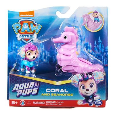 Exakt wie die Serienhelden bekommen auch die Hero Pups der Toyline für diese Mission abenteuerlustige Meeresbewohner zur Seite gestellt. Diese haben Rollen unter dem Bauch und bewegen, wenn sie geschoben werden, Flossen, Maul oder Schwanz. Die Welpen im OriginalLook der Aqua Pups Serienstaffel mit Tauchanzügen sind kompatibel mit allen PAW Patrol Standardspielsets und Fahrzeugen