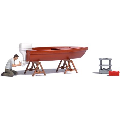 Bootsmechaniker, der einen Außenbordmotor instand setzt. Mit Boot, Reparaturböcken, Werkzeugwagen und Werkzeugkiste.
