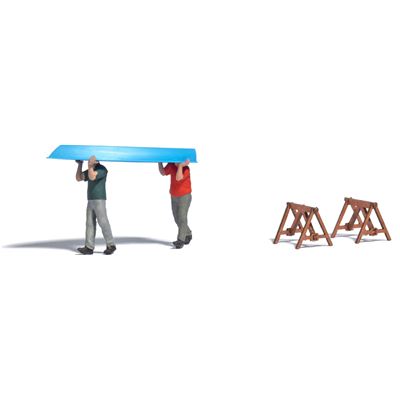 2 Männer, die ein Boot tragen. Mit Boot und Reparaturböcken.