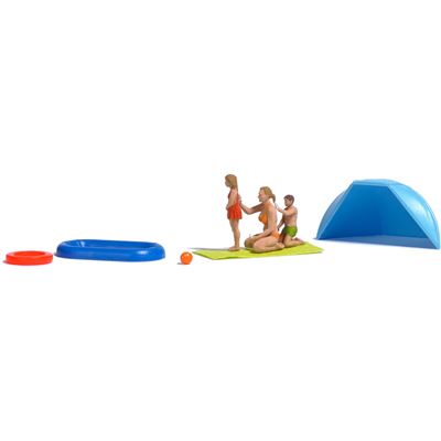 Achtung Sonnenstrahlen! Die junge Familie macht es richtig und schützt sich durch gegenseitiges Eincremen mit Sonnencreme. Mit Mutter, 2 Kindern, Liegetuch, Ball, Schwimmring, kleinem Gummiboot und Strandmuschel.